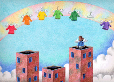 今日は晴天、洗濯日和。青い空には虹と一緒に7色の洗濯物が架かっている。