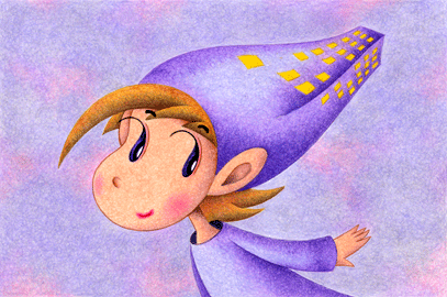ビルディングの形をした帽子を被った建物の妖精の子。