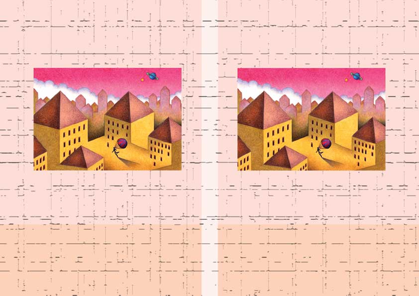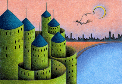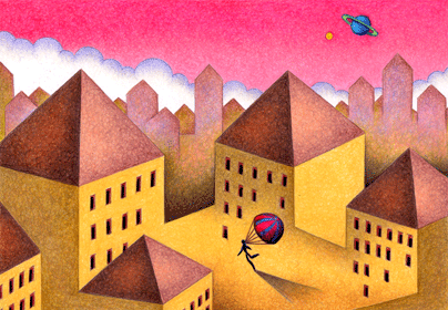 建物イラスト(トリックアート) - 「夕暮れの街」
