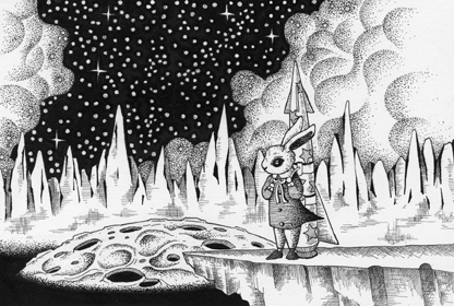 モノクロームイラスト (ペン画)[ウサギの月旅行]
