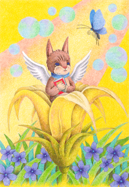 花の中から生まれた天使のような猫。メルヘンの世界を描いたイラスト。