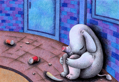寂れた街角、薄汚れた歩道にうずくまる様にして座る一人(一匹)の犀