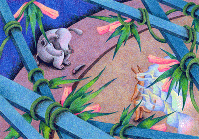 寂れた街角、薄汚れた歩道にうずくまる様にして座る一人(一匹)の犀