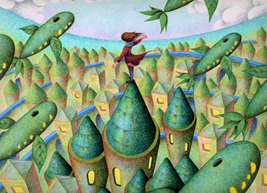 植物に覆われた尖塔の傍を大型の飛行植物がゆっくりと通り過ぎる。