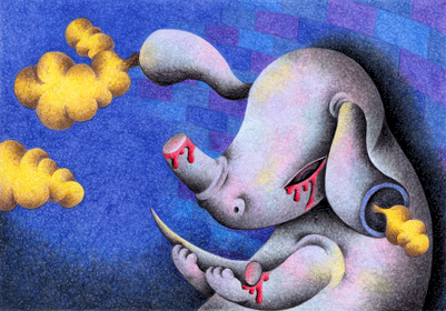 血の涙を流しながら折れてしまった角を悲しそうに見つめている。