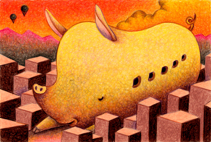 ブタを描いたイラスト。都会のど真ん中で鼾をかいて眠る巨大豚