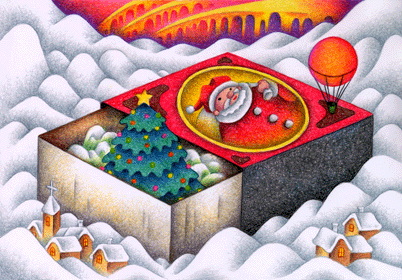 サンタクロースが描かれたその箱から大きなクリスマスツリーがそびえ立っている。