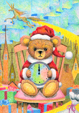 深夜午前零時、時計を抱えてクリスマスの日を告げるテディベア。