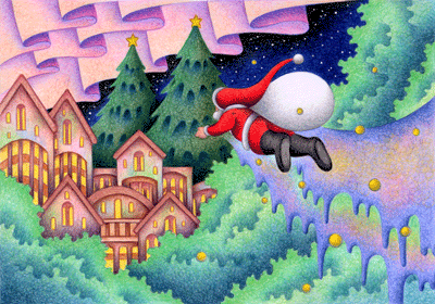 プレゼントを届けるため空を飛びながら家々に向かっているサンタクロース。