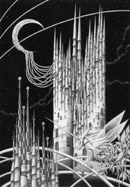 モノクロームイラスト(鉛筆画) - 「月を捉えた塔」