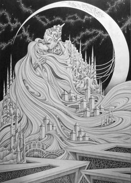 モノクロームイラスト(鉛筆画) - 「都市と海の恋」