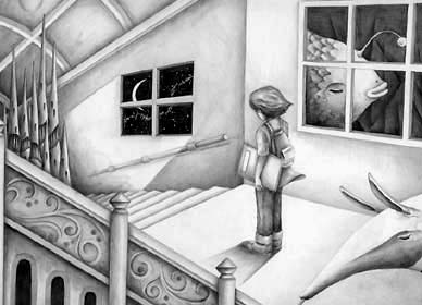 旧い建物の中の階段。窓の外には異形の生物や異空間が見える。そして階下には古代都市。