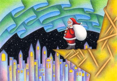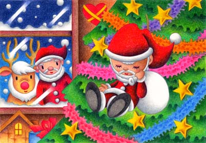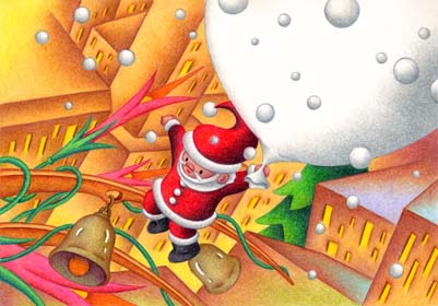 クリスマスイラスト(色鉛筆画) - 「やってきたサンタクロース」