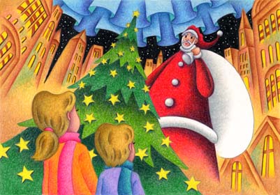 クリスマスイラスト(色鉛筆画) - 「大きなサンタとクリスマスツリー」